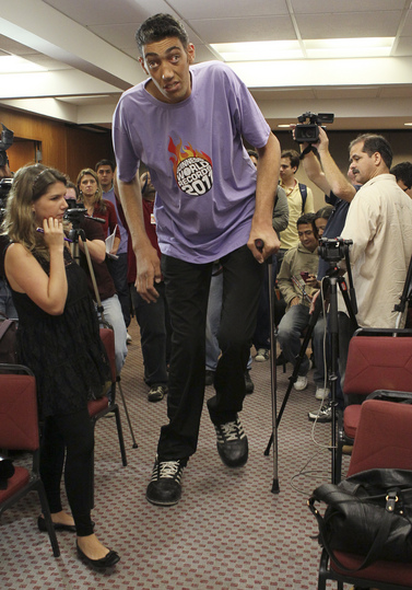 The world’s tallest man, Sultan Kosen of Turkey, arrives at a news conference in Rio de Janeiro November 18, 2010. Kosen, at 2 metres 46.5 cm (8 feet 1 inch) tall, also claims the record for the largest hands and largest feet. He attended an event to promote the Guinness World Records 2011 book. REUTERS/Sergio Moraes (BRAZIL – Tags: SOCIETY)